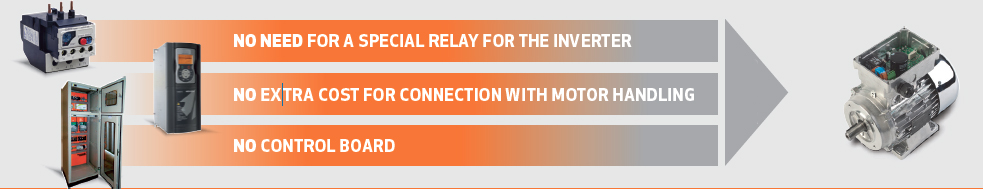Inverseur incorporé au moteur électrique, en maintenir les dimensions standard. Carte Inverseur montée à l’intérieur de la boîte du bornier standard pour pouvoir utiliser des moteurs asynchrones plutôt que des moteurs monophasés.